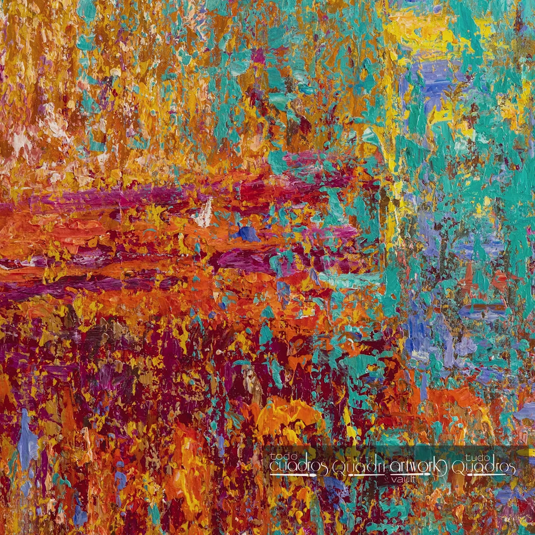 El cuadro en sí mantiene un estilo abstracto con una combinación intensa de colores, principalmente turquesa y naranja, acompañados de detalles en amarillo, púrpura y rojo.
