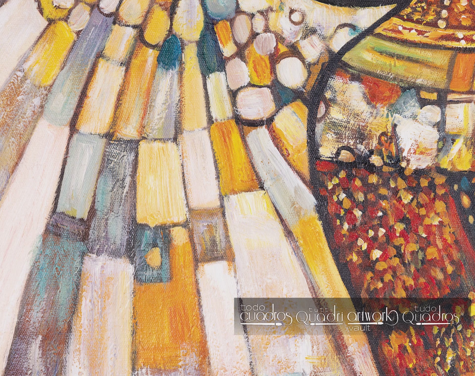 Este cuadro inspirado en el estilo de Gustav Klimt muestra una figura angelical con una expresión serena y etérea. La protagonista, una mujer de cabello rizado en tonos rojizos, inclina suavemente la cabeza hacia atrás, con los ojos cerrados, transmitiendo una sensación de paz. Sus alas y ropa, compuestas por una amalgama de patrones geométricos en tonos dorados, blancos y ocres, evocan una textura de mosaico, característica del trabajo de Klimt.